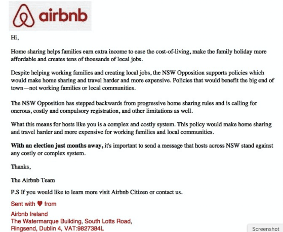 From our friends at Neighbours not Strangers: MEDIA RELEASE Saturday, 15 December 2018 AIRBNB (Ireland) WANTS YOU TO VOTE LNP…